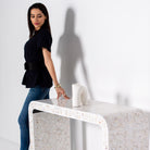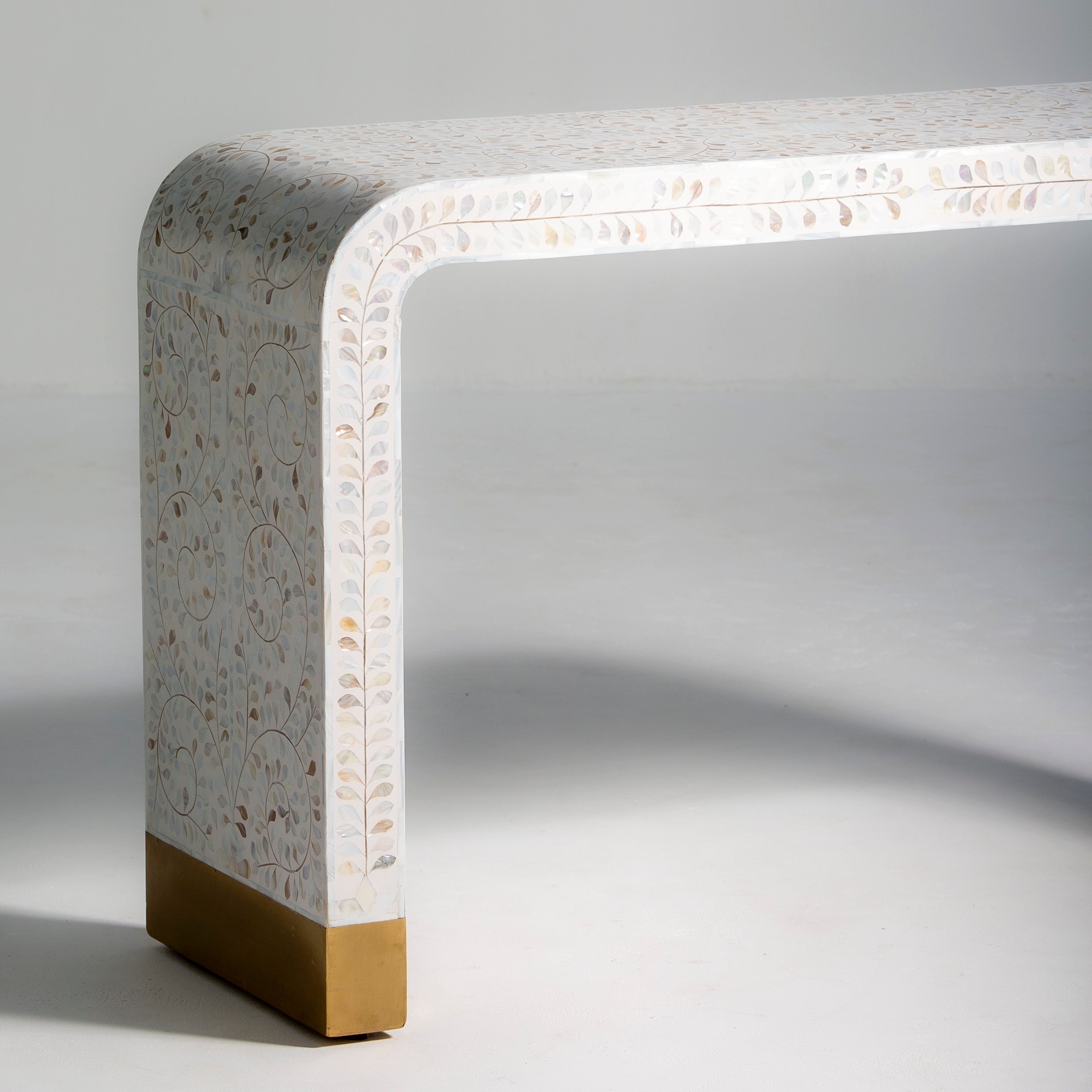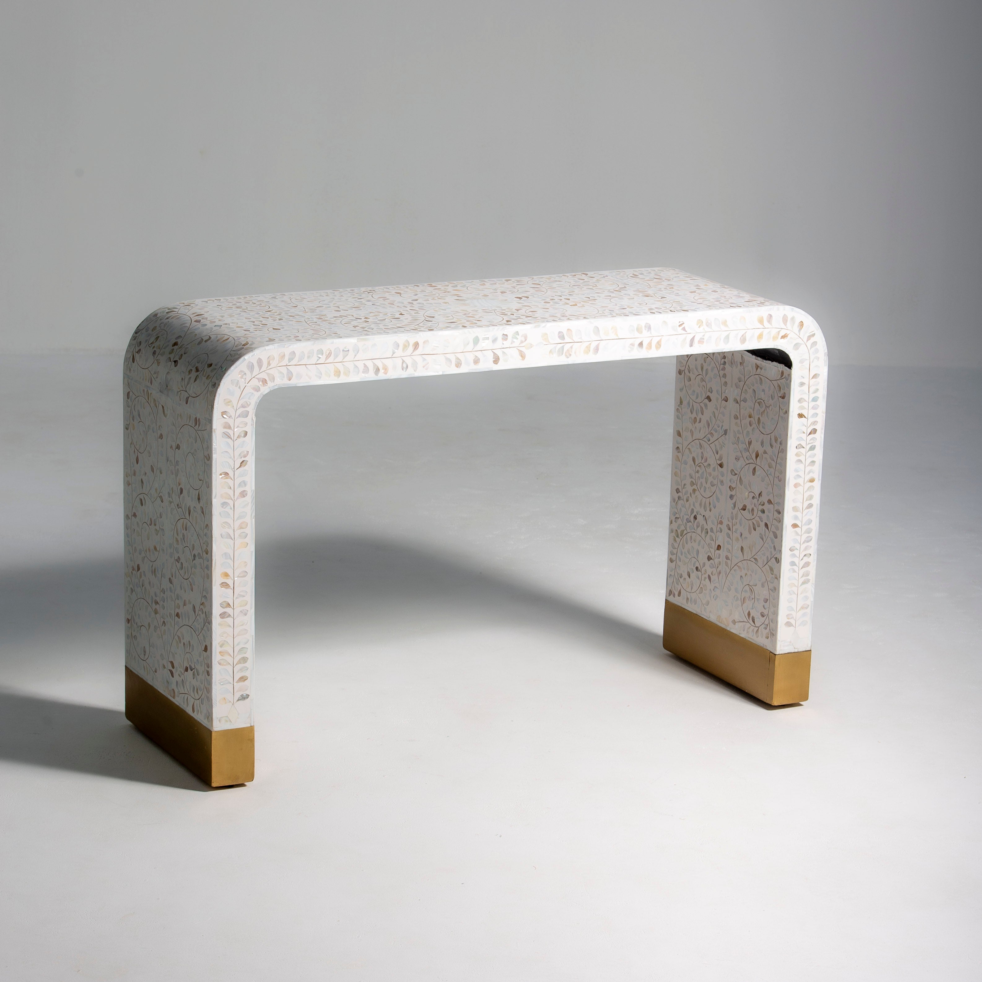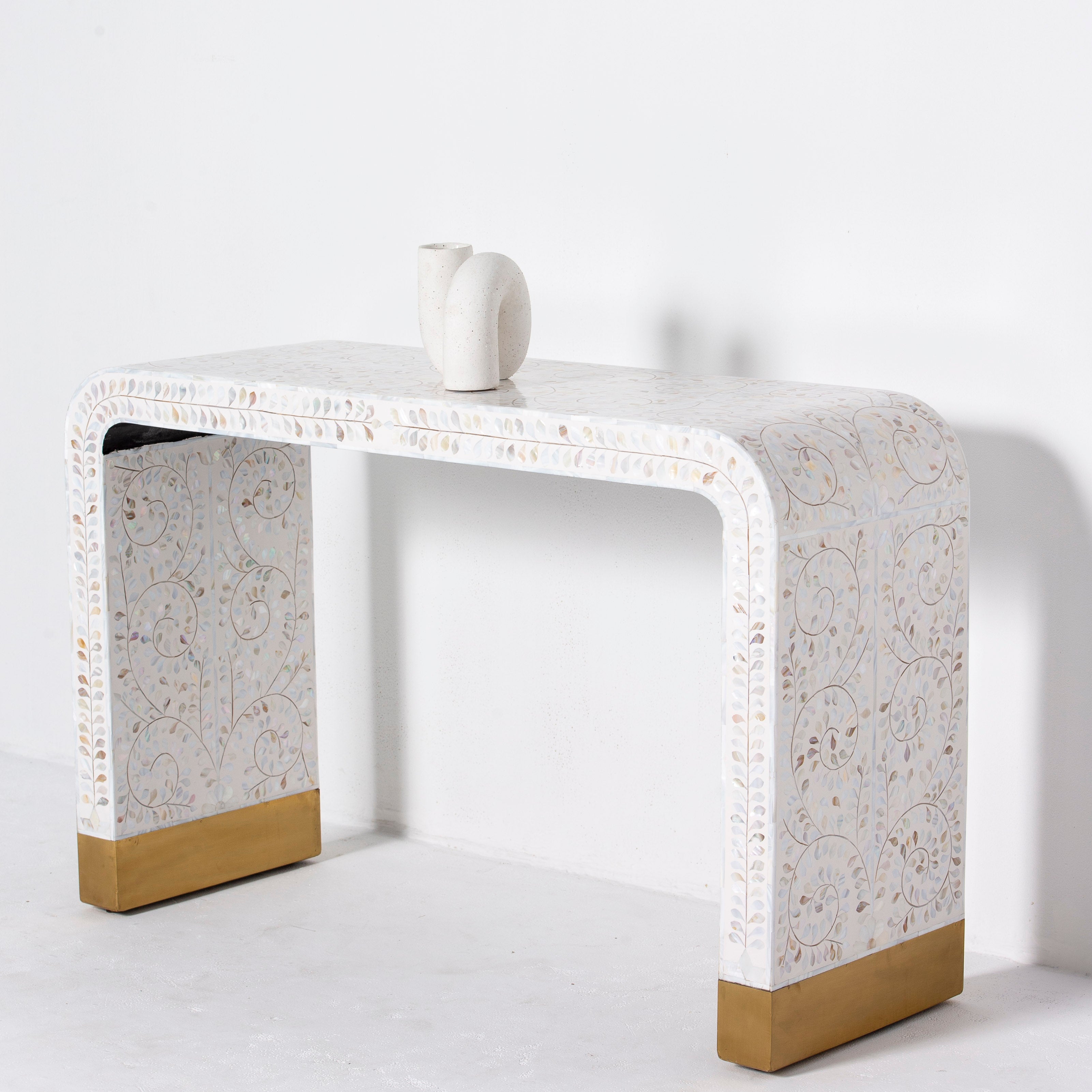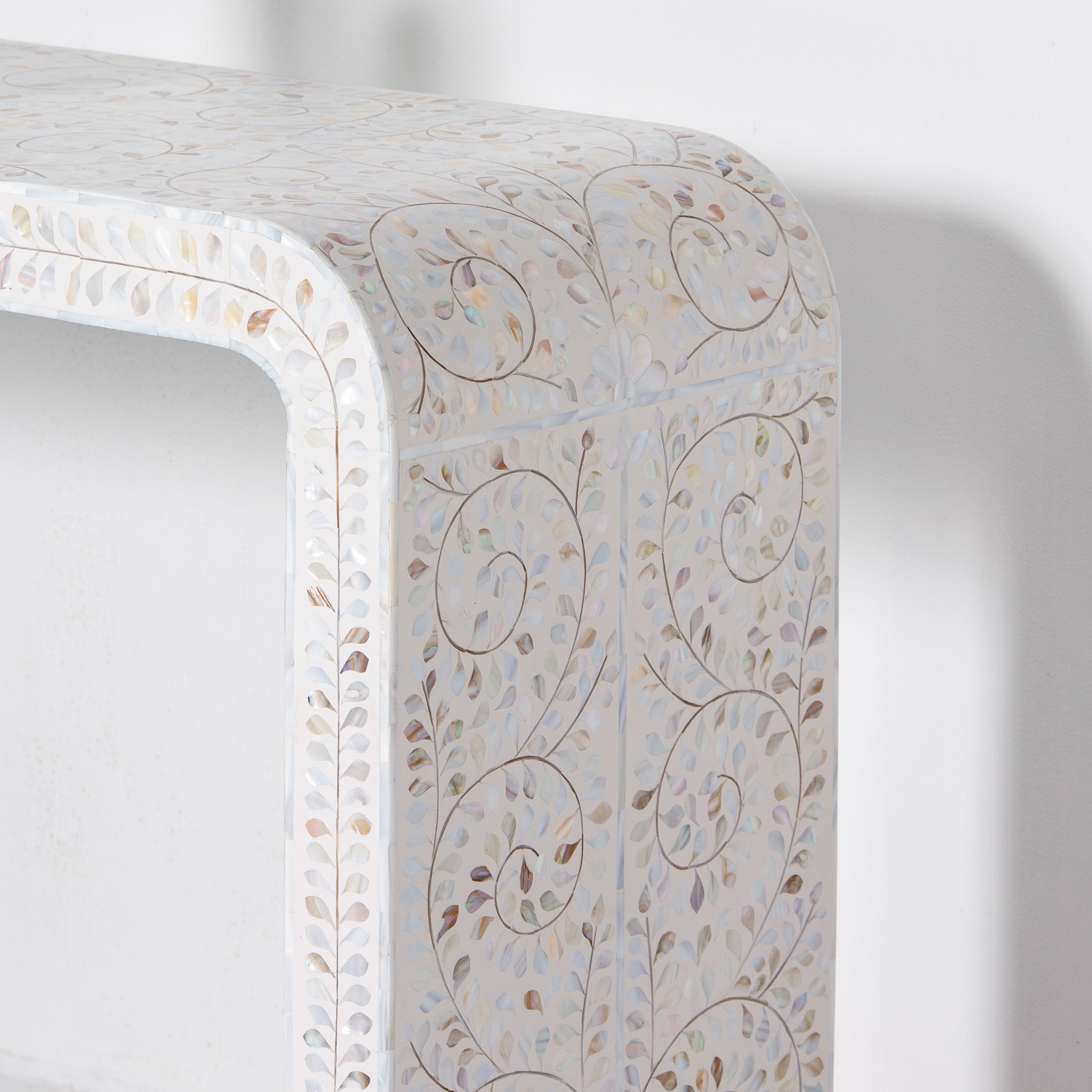 Crafted with meticulous attention to detail, this U-shaped console table showcases the natural beauty of ocean pearl mother-of-pearl inlay against pristine white surfaces. The elegant curved design creates a striking focal point while offering practical display space for treasured collections or decorative accents. Each piece celebrates traditional artisanal craftsmanship, blending timeless sophistication with contemporary styling. Perfect for entryways, living rooms, or as a statement piece that elevates any interior with understated luxury and refined elegance.