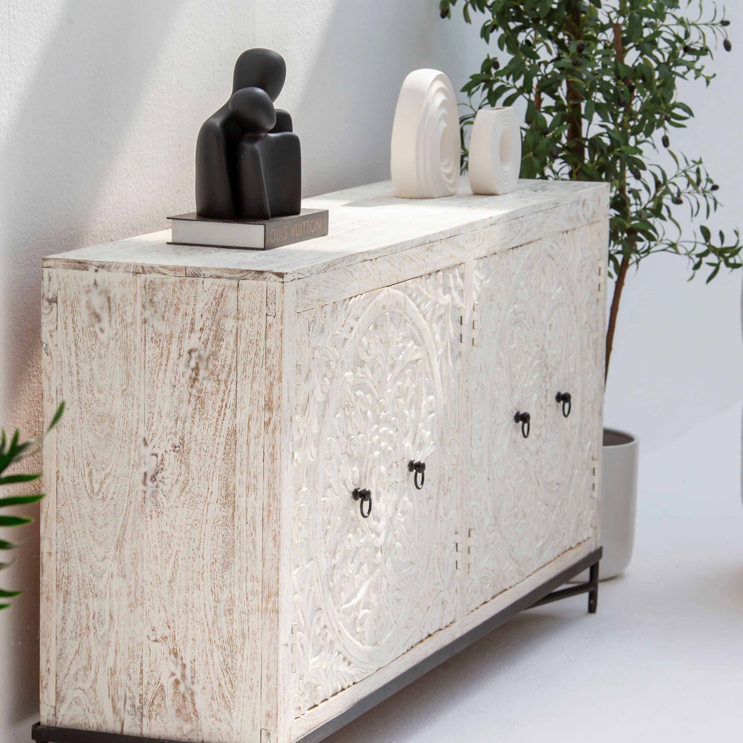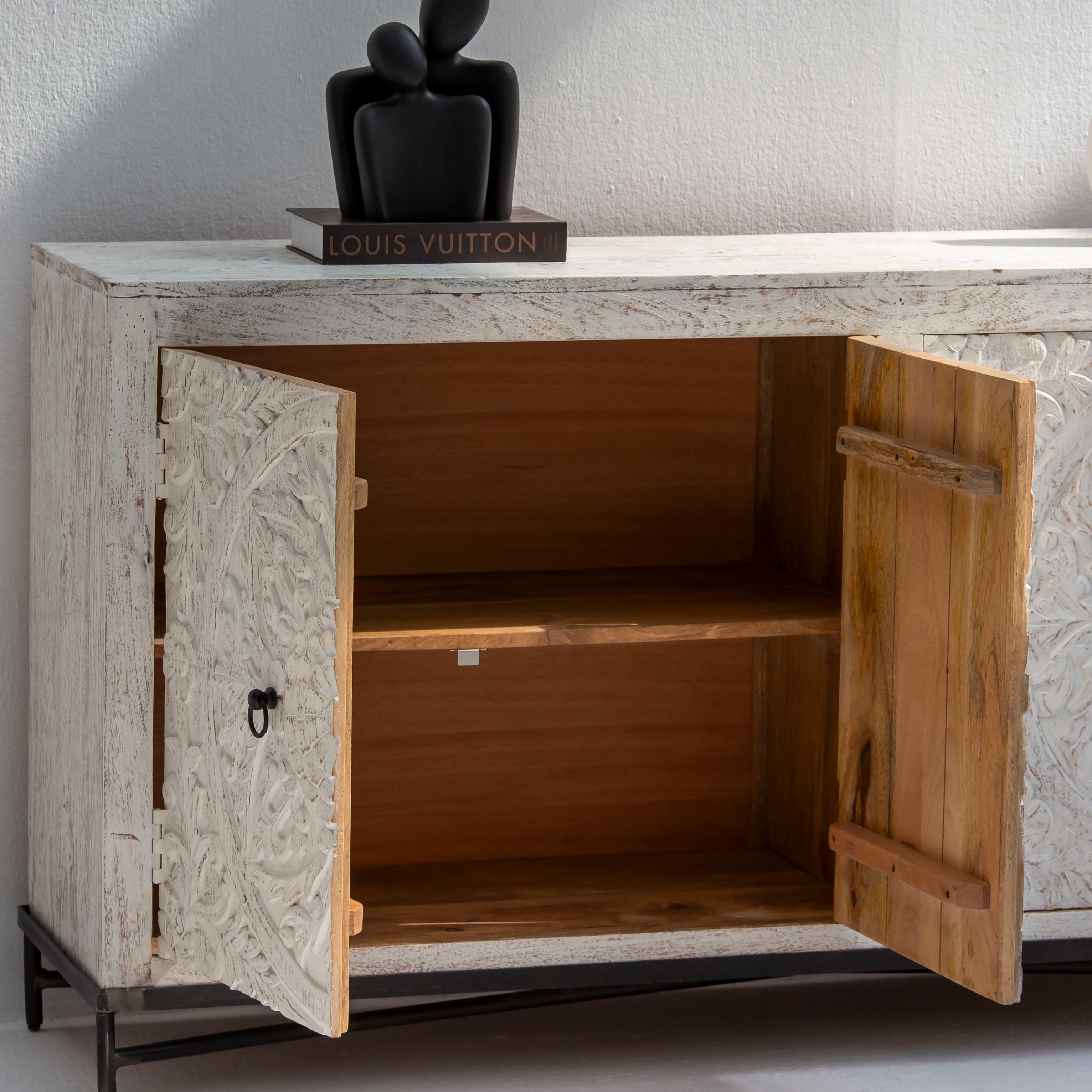 Whether placed in a dining room, living room, or entryway, this sideboard serves as a functional showpiece. The natural wood tones and carved details bring warmth and character to any space, while the minimalist silhouette ensures it complements a variety of décor styles.
