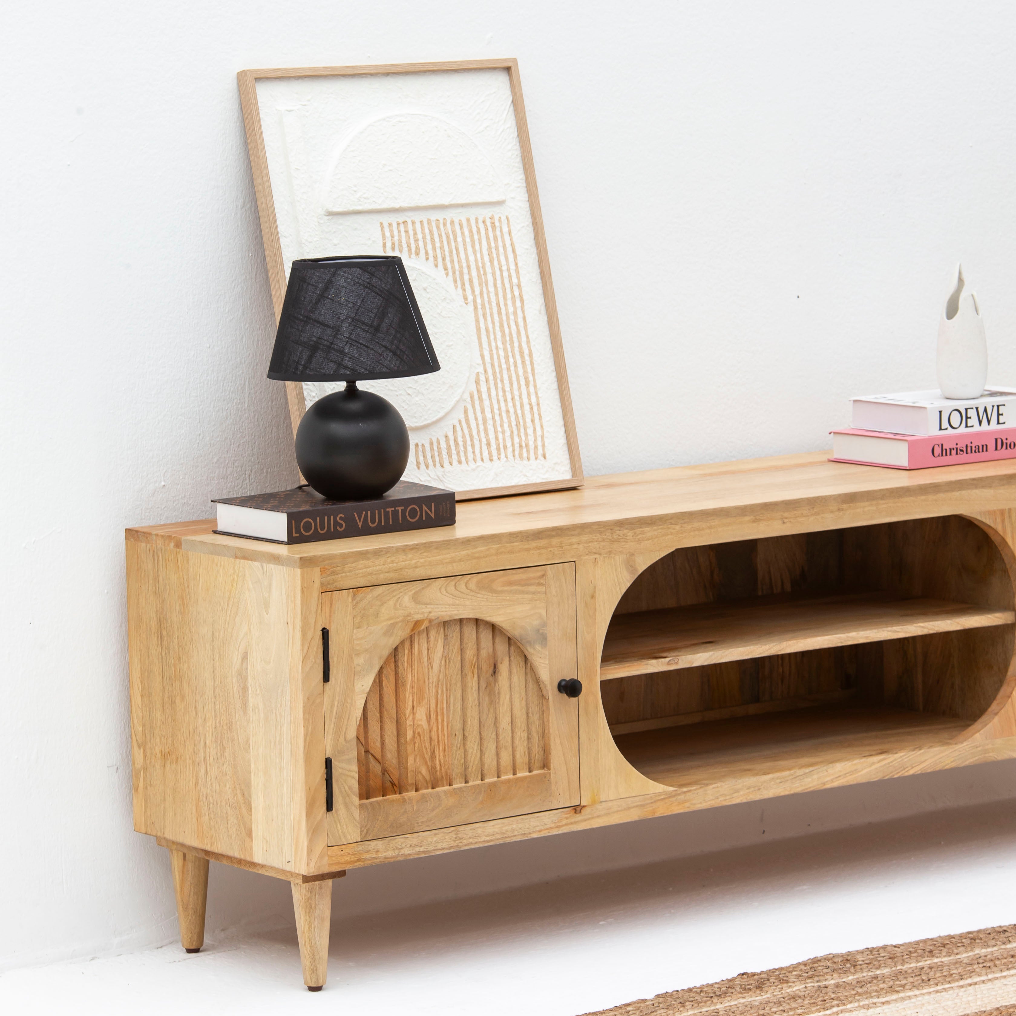 The CANOVA RAATAN Two Door TV Stand brings authentic craftsmanship to your living space. Handcrafted from solid mango wood with traditional rattan detailing, this piece showcases the artistry of Indian woodworking. The two-door design provides ample storage for media components and entertainment essentials, while the warm wood tones and natural rattan accents add organic character to any room. A timeless investment that marries functionality with handmade beauty.