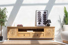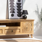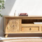 Handcrafted from solid mango wood, this CARVA TV stand brings authentic artisanal charm to your living space. Each piece showcases intricate traditional carving details, reflecting the skilled craftsmanship of Indian woodworkers. The sturdy construction ensures reliable support for your television while adding warmth and character to any room. A timeless investment that celebrates natural wood beauty and time-honored techniques.