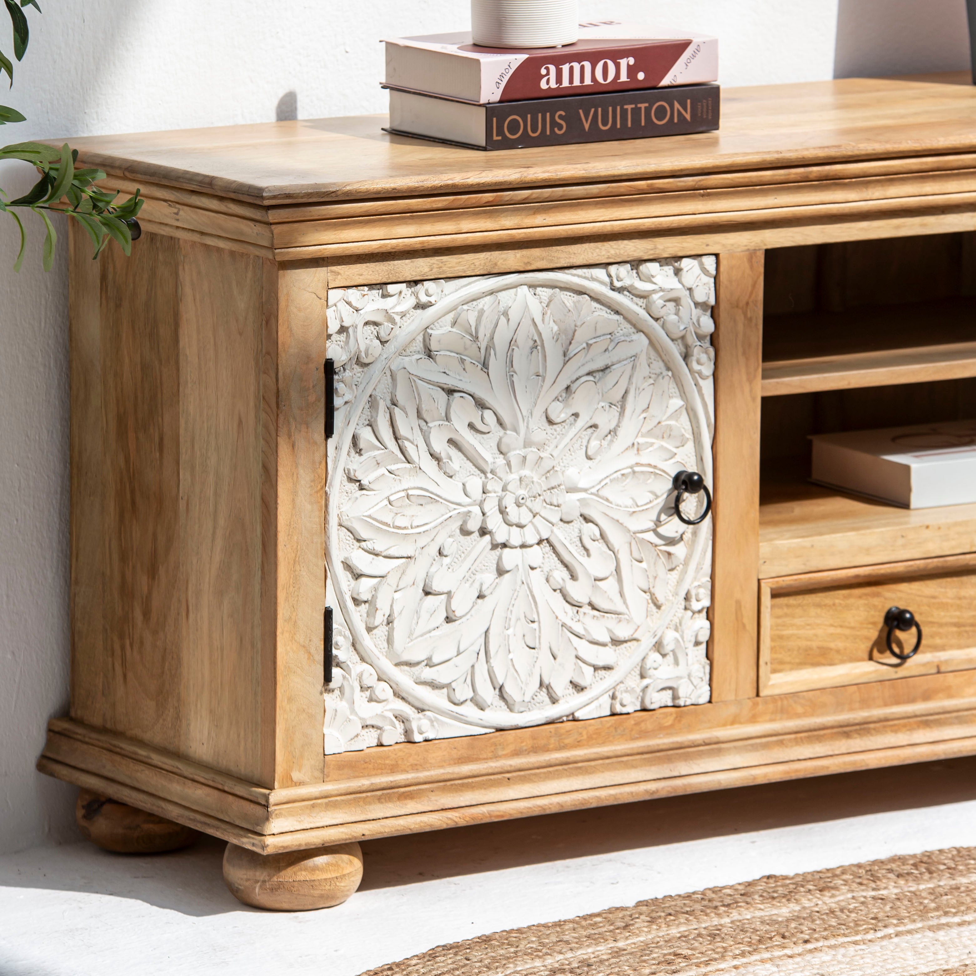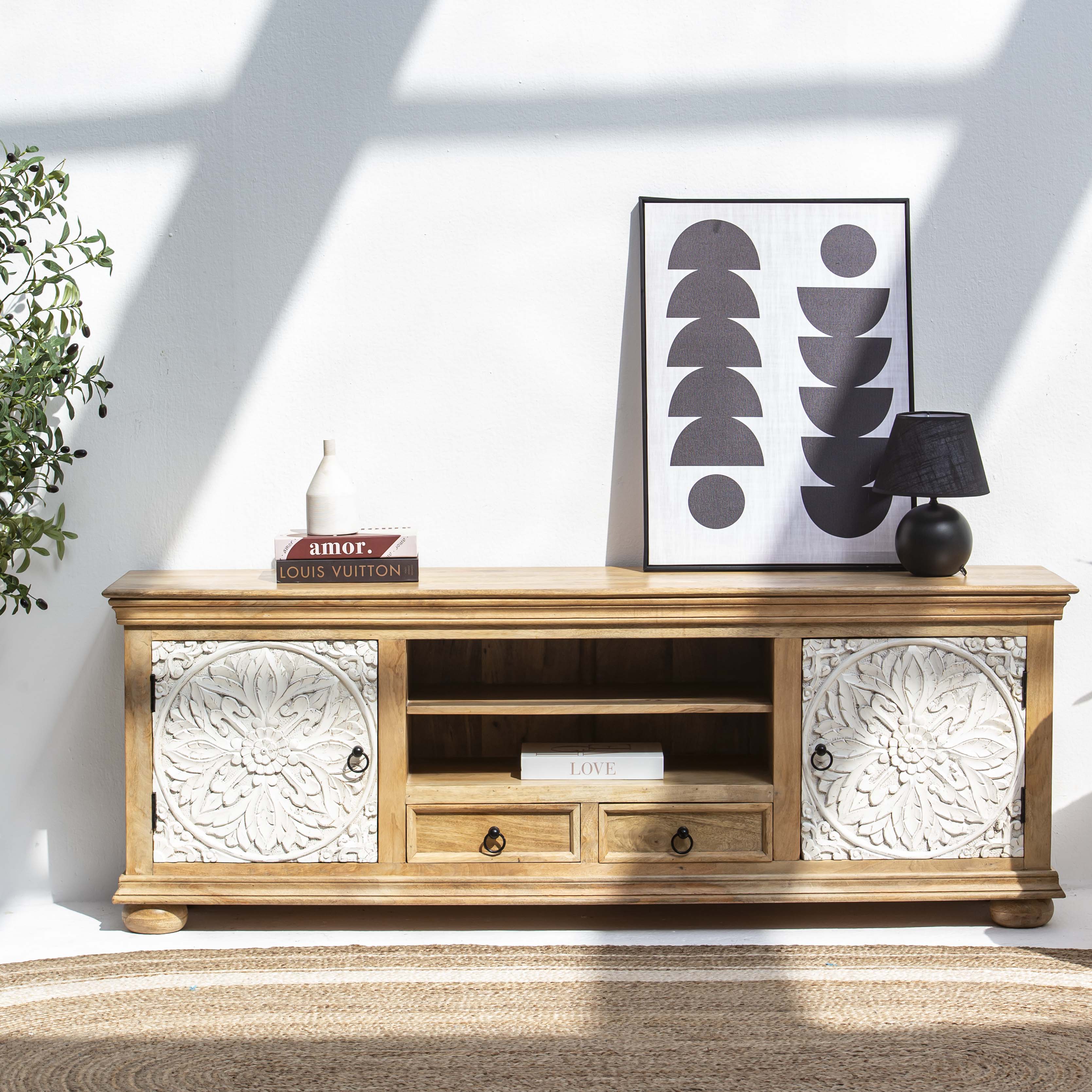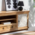 The Vanelle Wooden TV Unit brings warmth and character to your living space with its handcrafted appeal. Expertly crafted from solid mango wood sourced in India, this TV stand showcases the natural grain and rich tones that only authentic wood can offer. Its sturdy construction ensures reliable support for your television while adding an artisanal touch to your home décor. Perfect for those who appreciate quality craftsmanship and timeless design, the Vanelle combines functionality with rustic elegance.