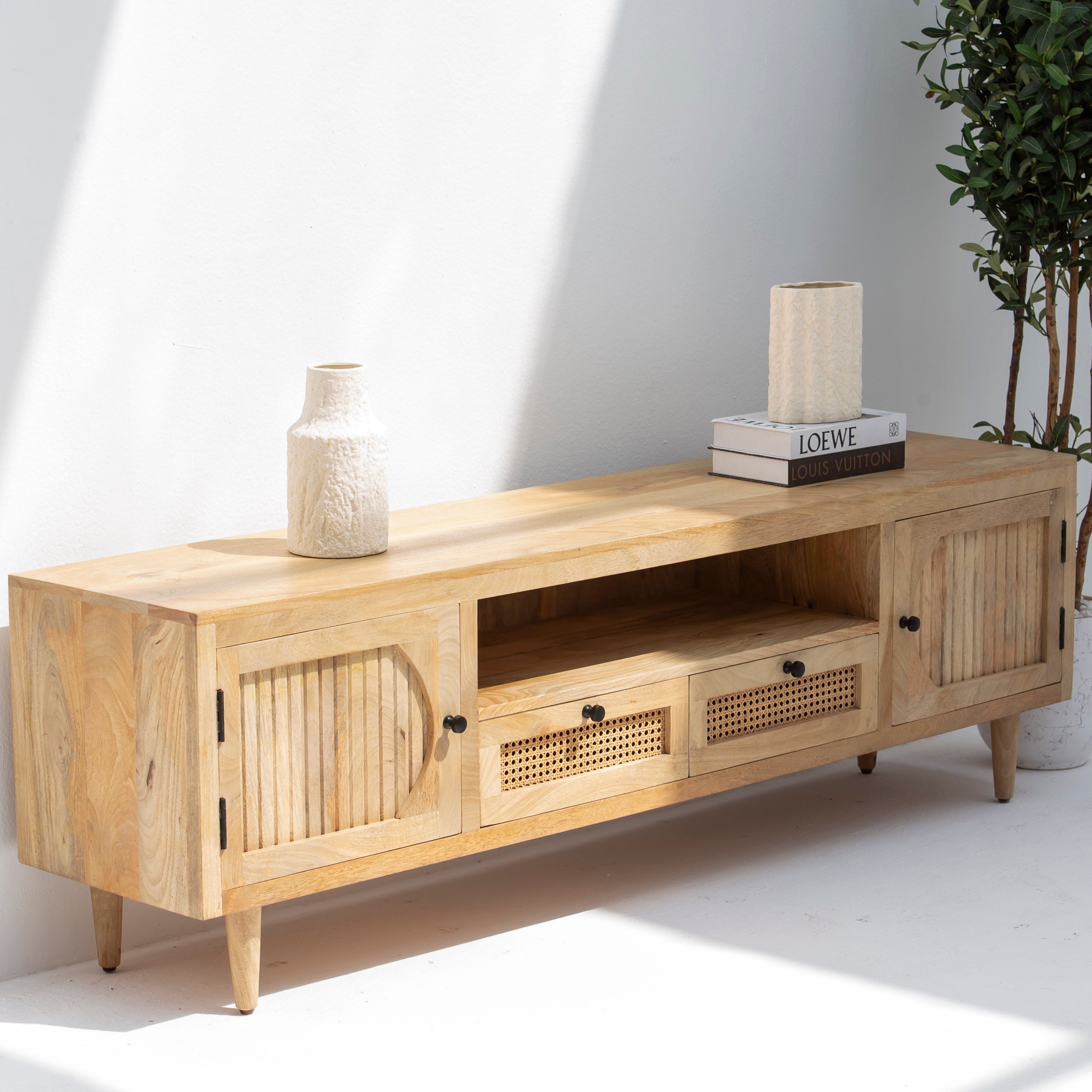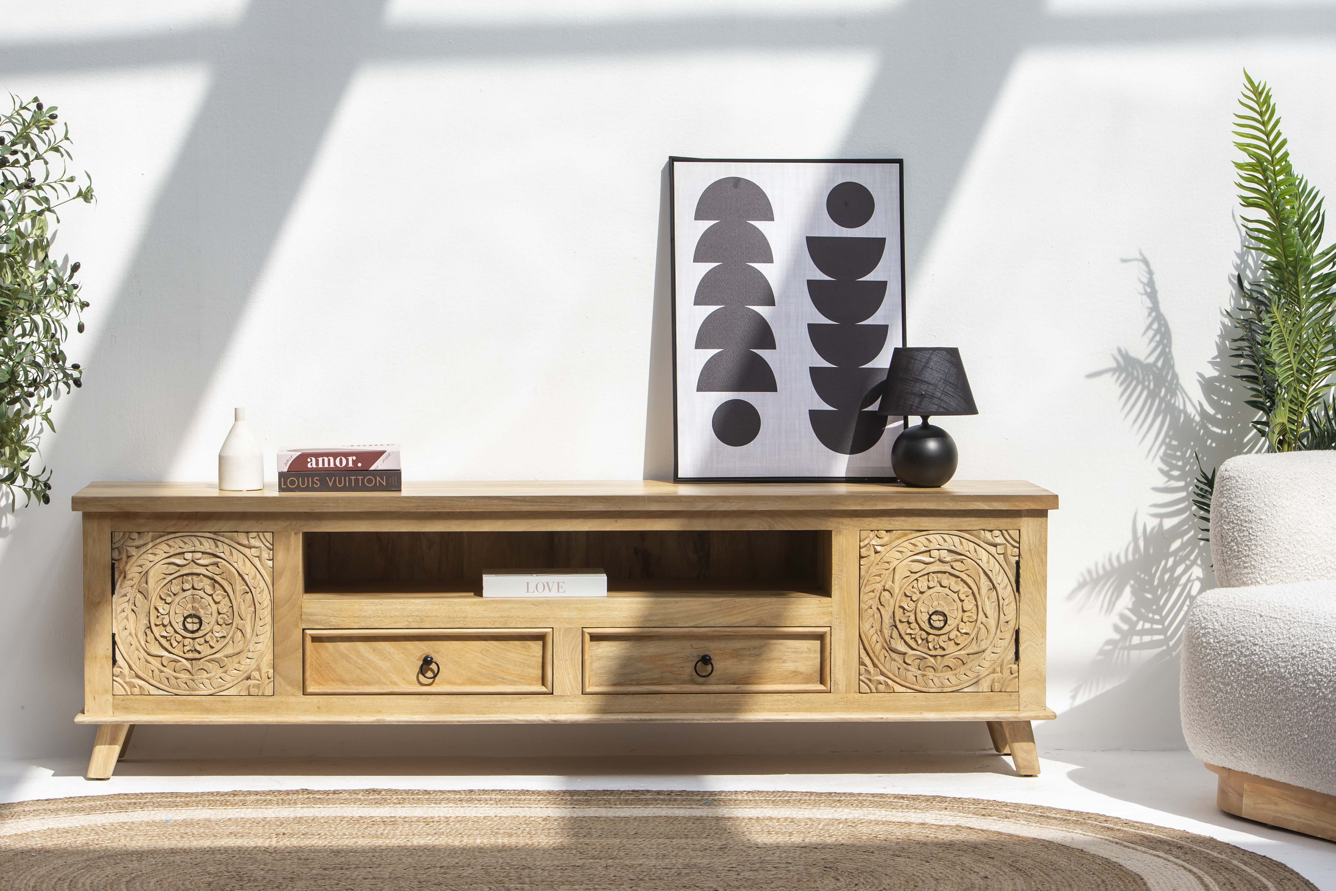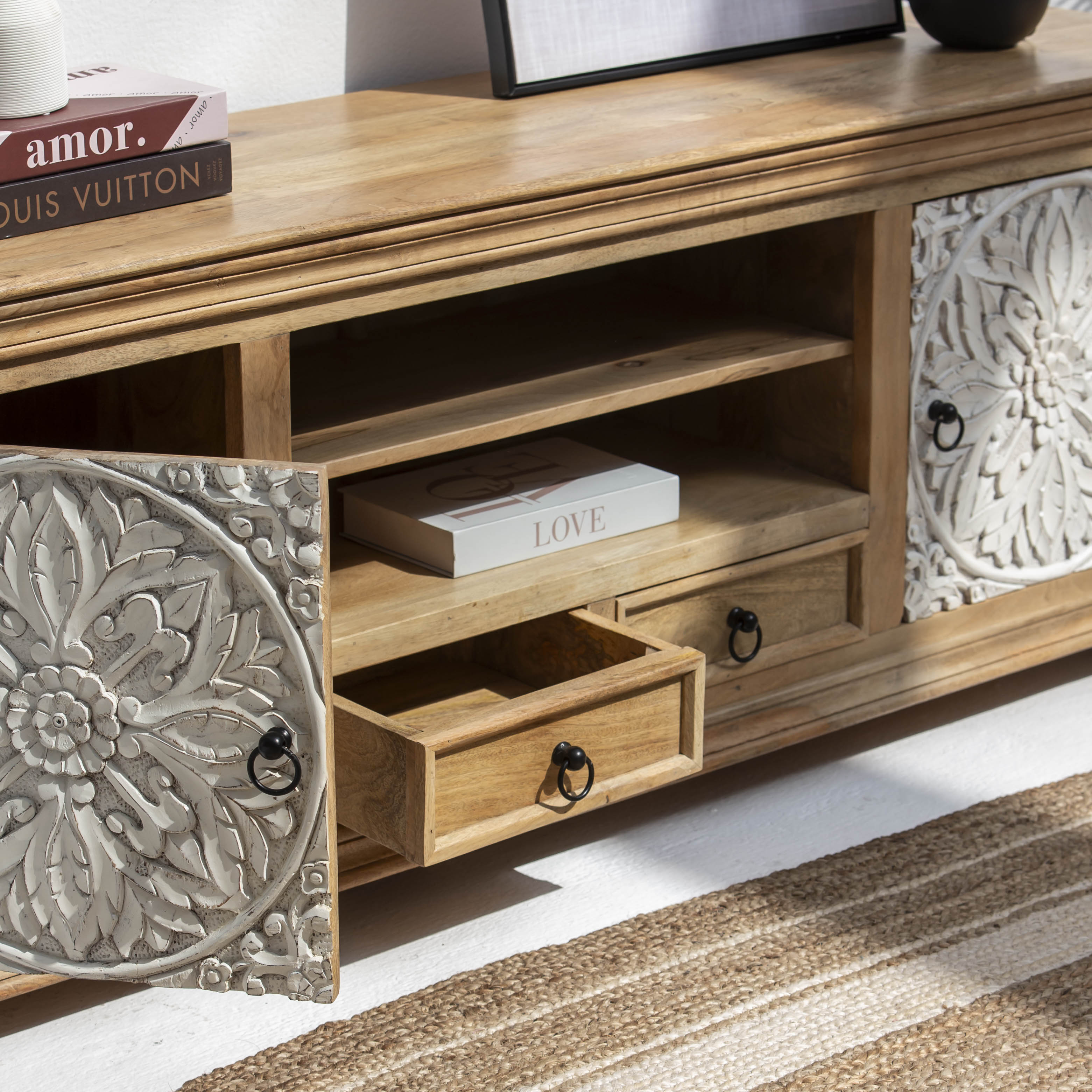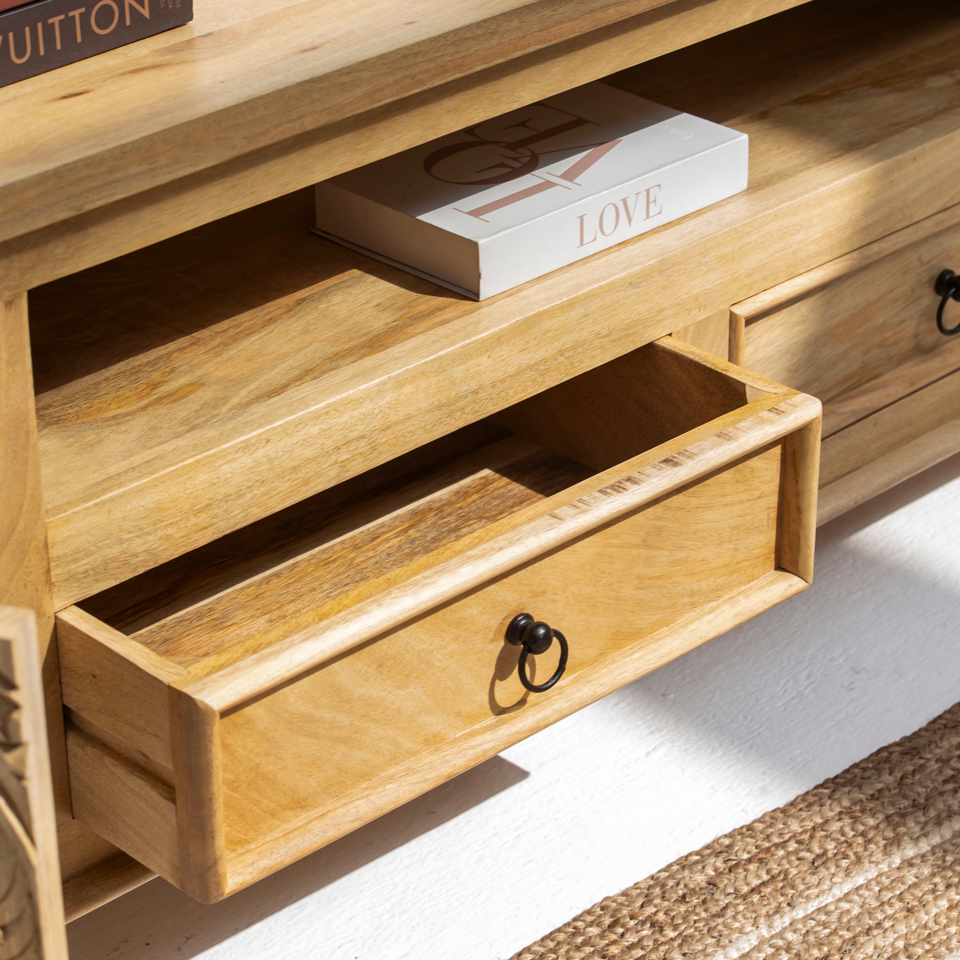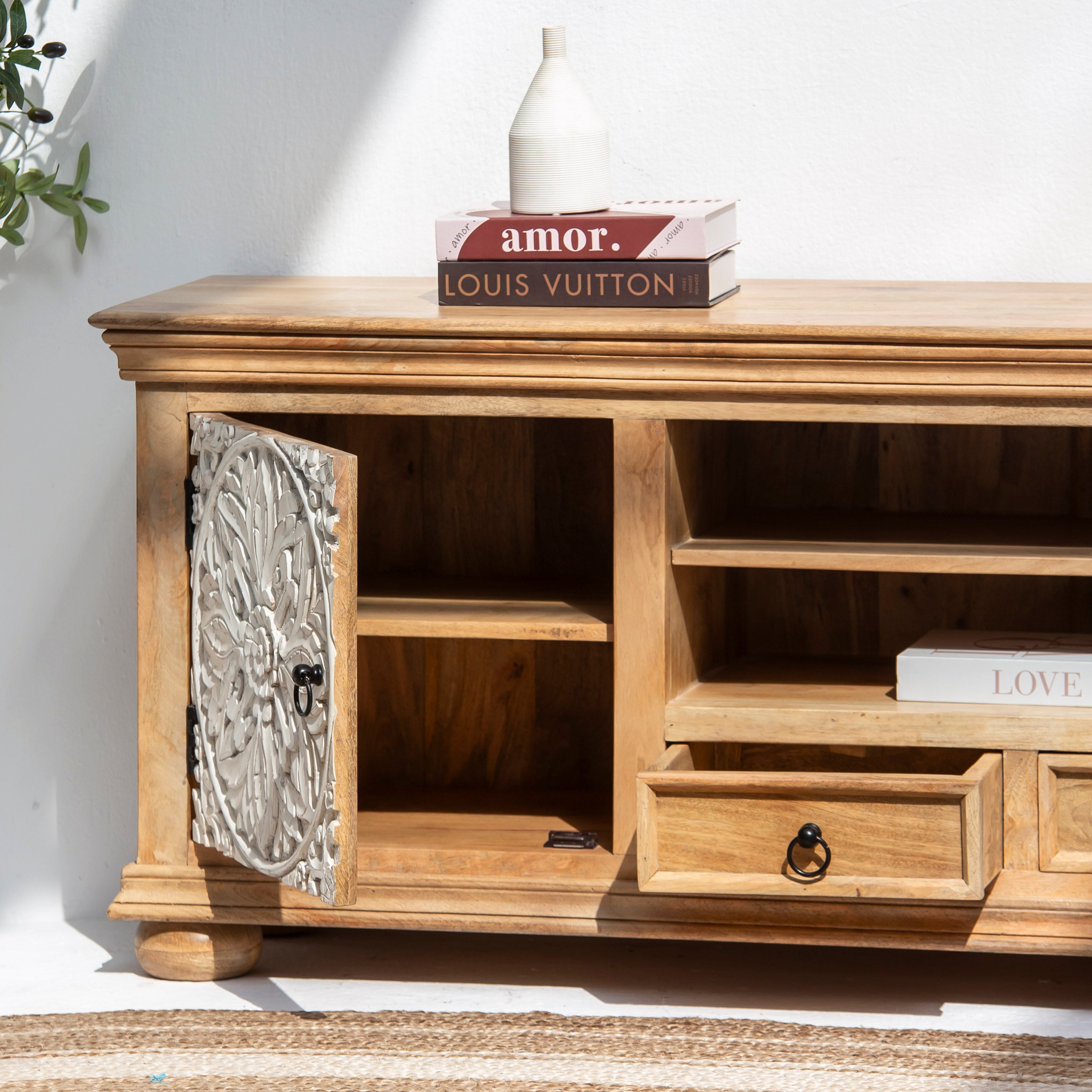 Crafted from rich, durable hardwoods like Sheeshm, Mango, or Teak, these media units feature: