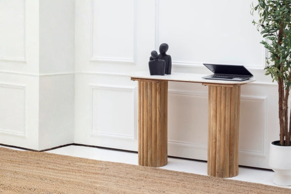 This Pushkar nightstand table showcases traditional wooden carving artistry. Constructed from solid mango wood, it features a natural finish with intricate carved detailing and elegant golden knobs. The single drawer and door provide practical storage for bedside essentials, while the carved white accents add timeless sophistication. Perfect for those seeking authentic craftsmanship and functional bedroom furniture with cultural character.